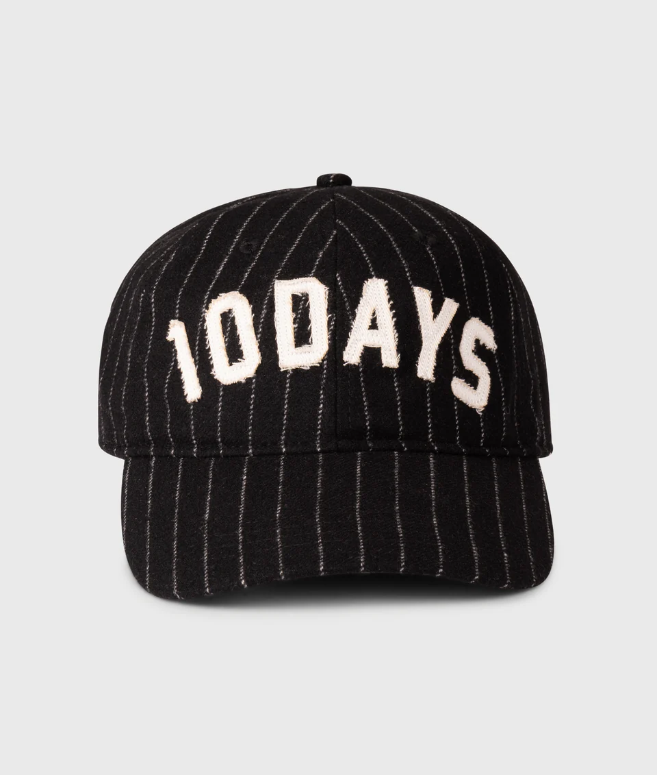 10 Days, zwart – wit gestreepte pet met witte 10 days opdruk.