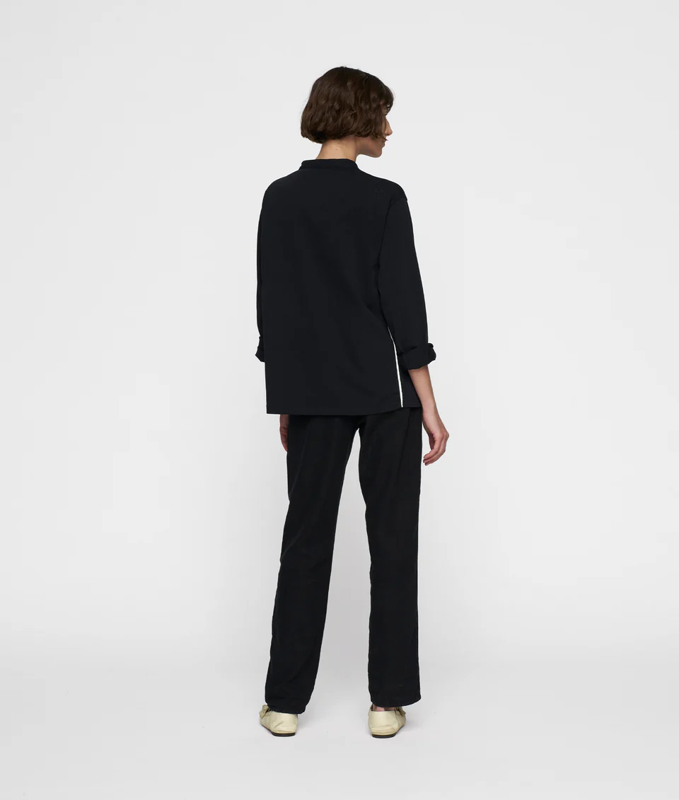 10 Days, zwarte hoge pantalon met elastische band, steekzakken en ceintuur koord. De broek heeft een witte print op de voorkant van de pijp.