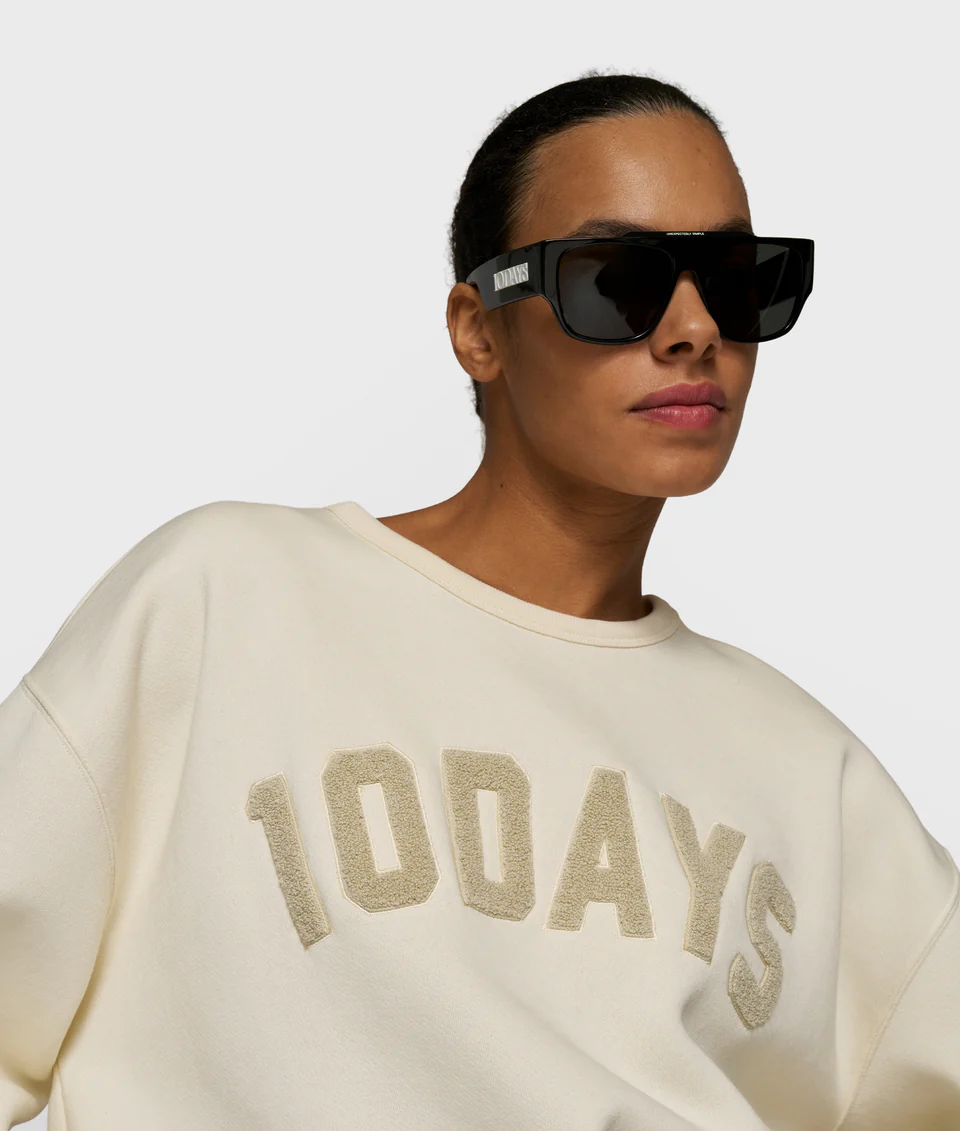 10 Days, ruimvallende, ecru sweater met ronde hals en lange mouw. De sweater heeft een print op het voorpand en een elastische band aan de onderzijde.