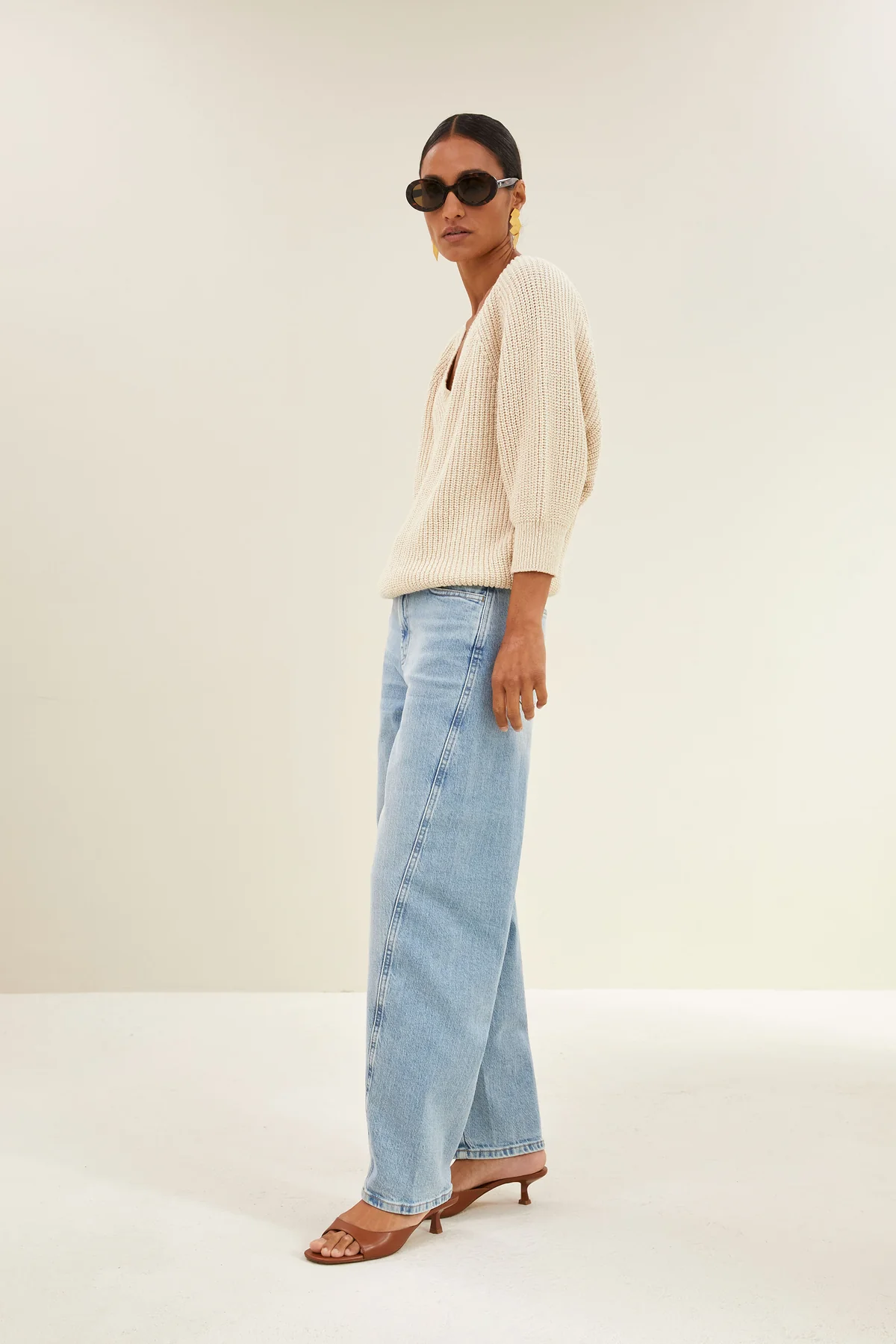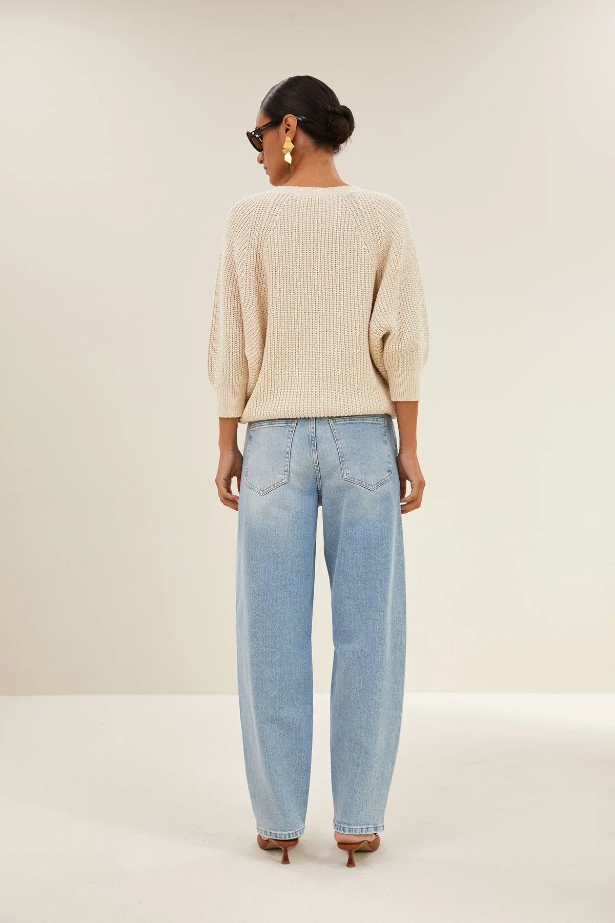 By Bar, ruimvallende, ecru trui met v-hals en 3/4 mouw.