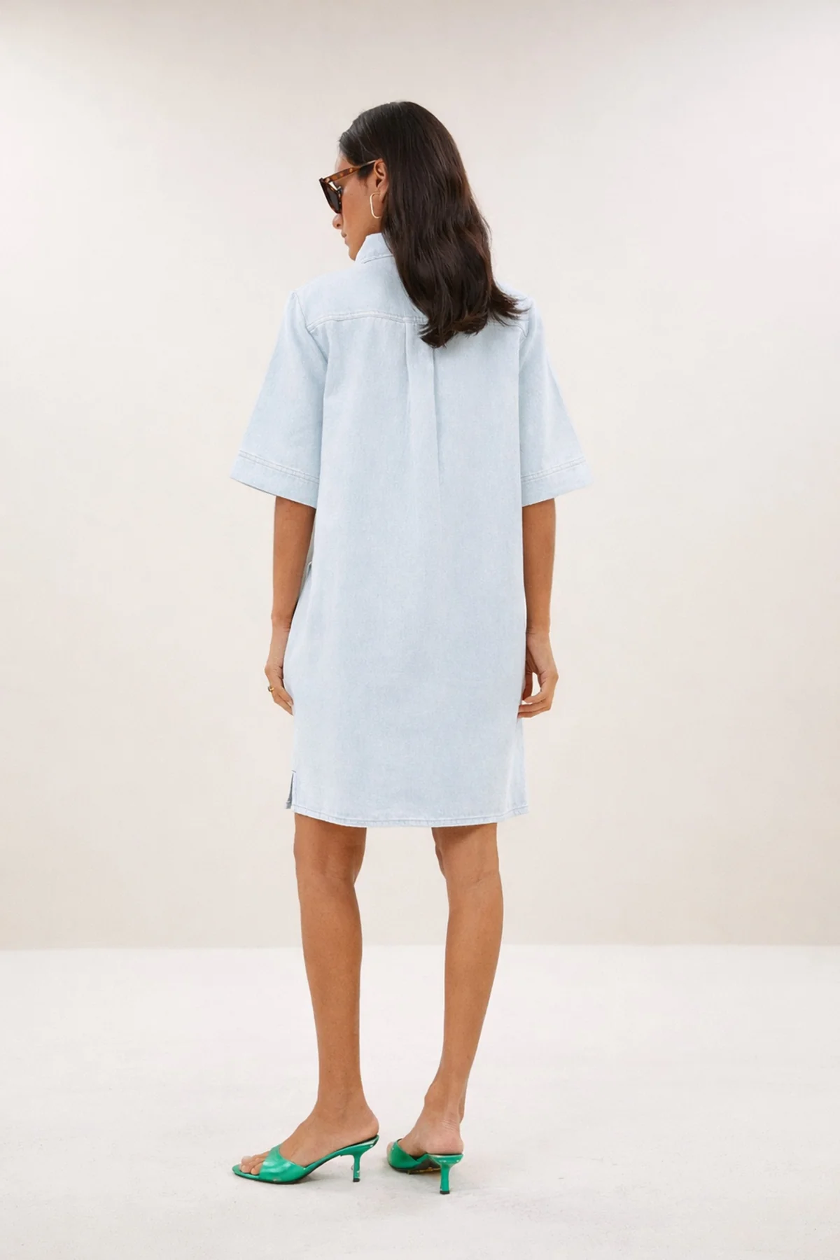 By Bar, licht blauwe jeans jurk met korte mouw, ritssluiting en steekzakken.
