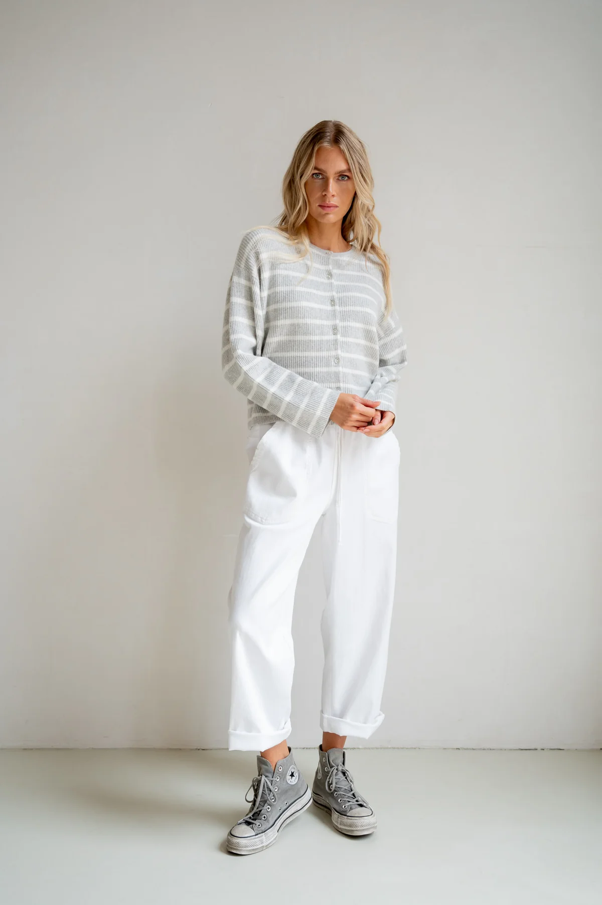 Penn & Ink, grijs melee – ecru streep vest met ronde hals en lange mouw.