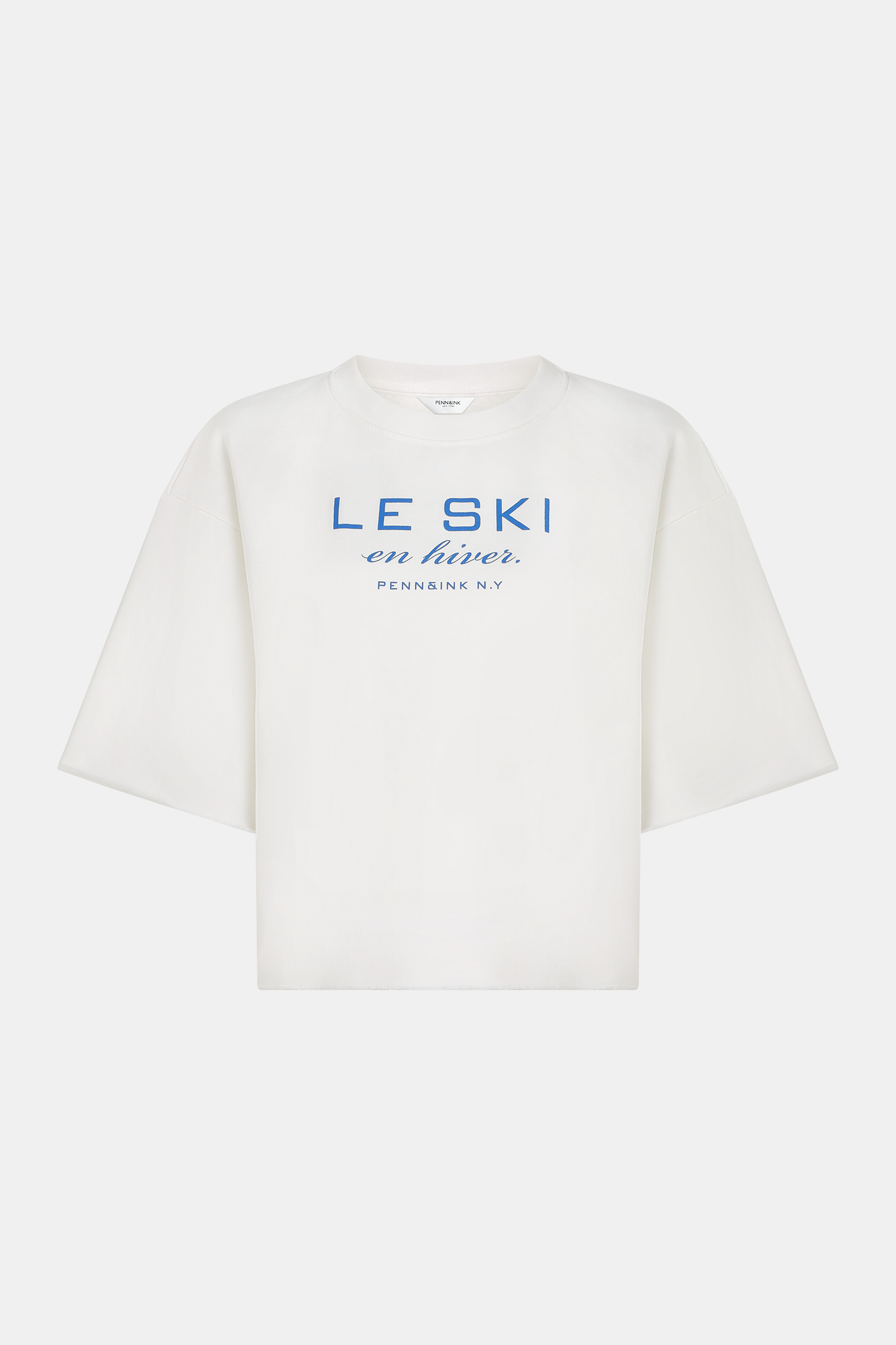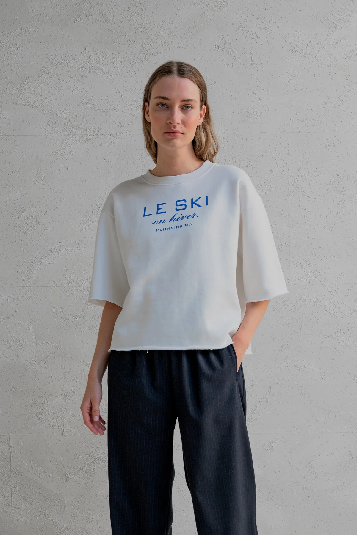 Penn & Ink, gebroken witte sweater met ronde hals en korte mouw. De sweater heeft een koblat blauwe print op het voorpand.