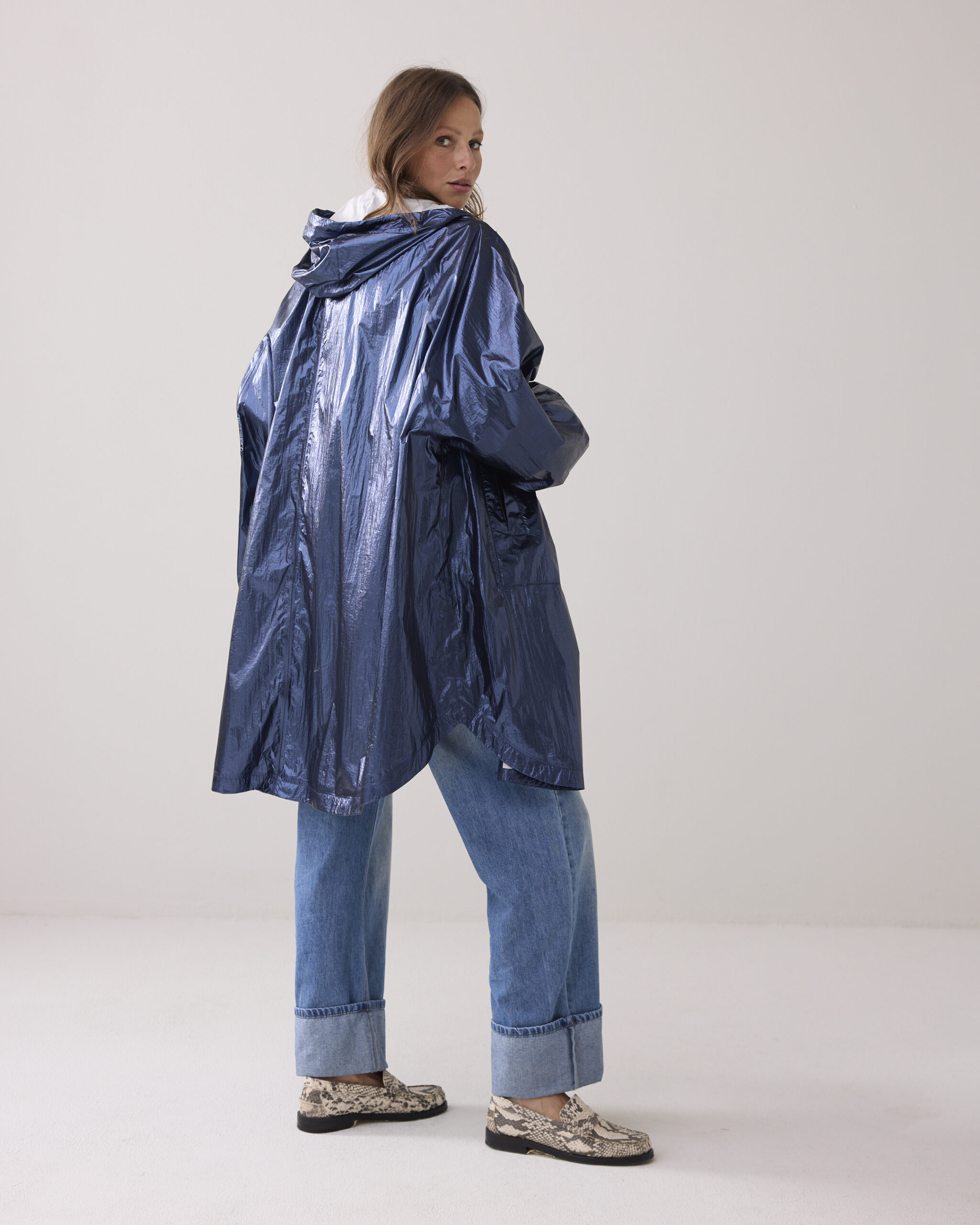 Summum Woman, zeer ruimvallende blauwe waterdichte dunne regenjas met ritssluiting en capuchon.