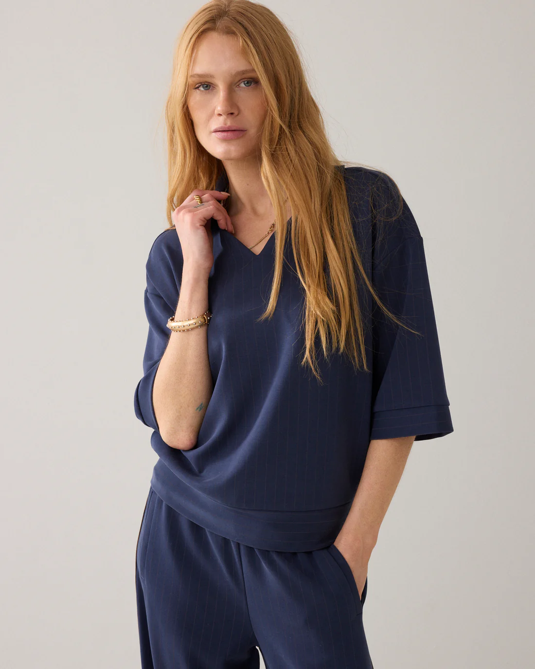 Summum Woman, ruimvallende, donker blauwe krijt streep scuba sweater met v-hals, kraag en 3/4 mouw.
