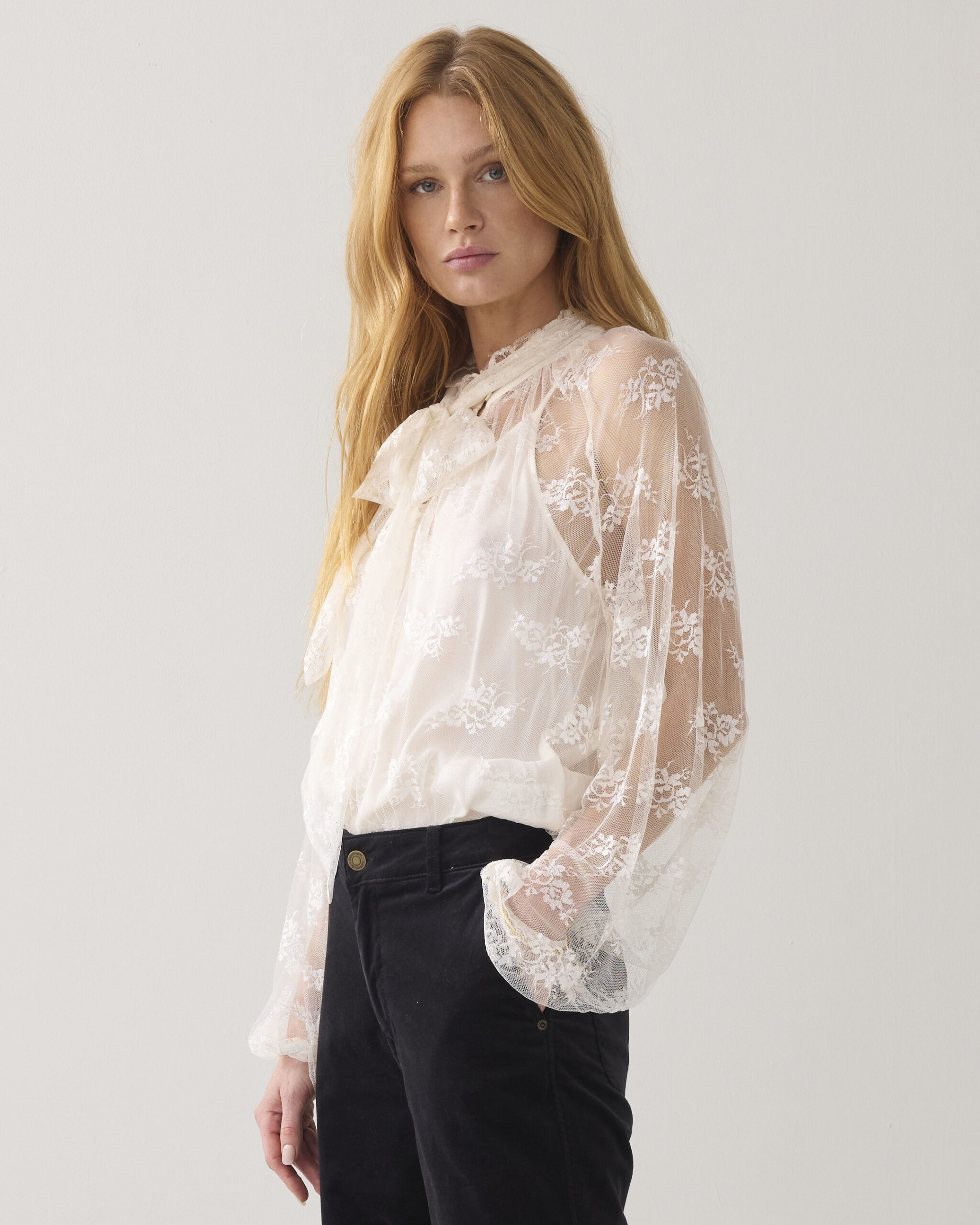 Summum Woman, ruimvallende, ecru kanten blouse met splitje, opstaande boord met ruches, afneembare strik en wijde lange mouw. De blouse wordt geleverd met een los singlet.
