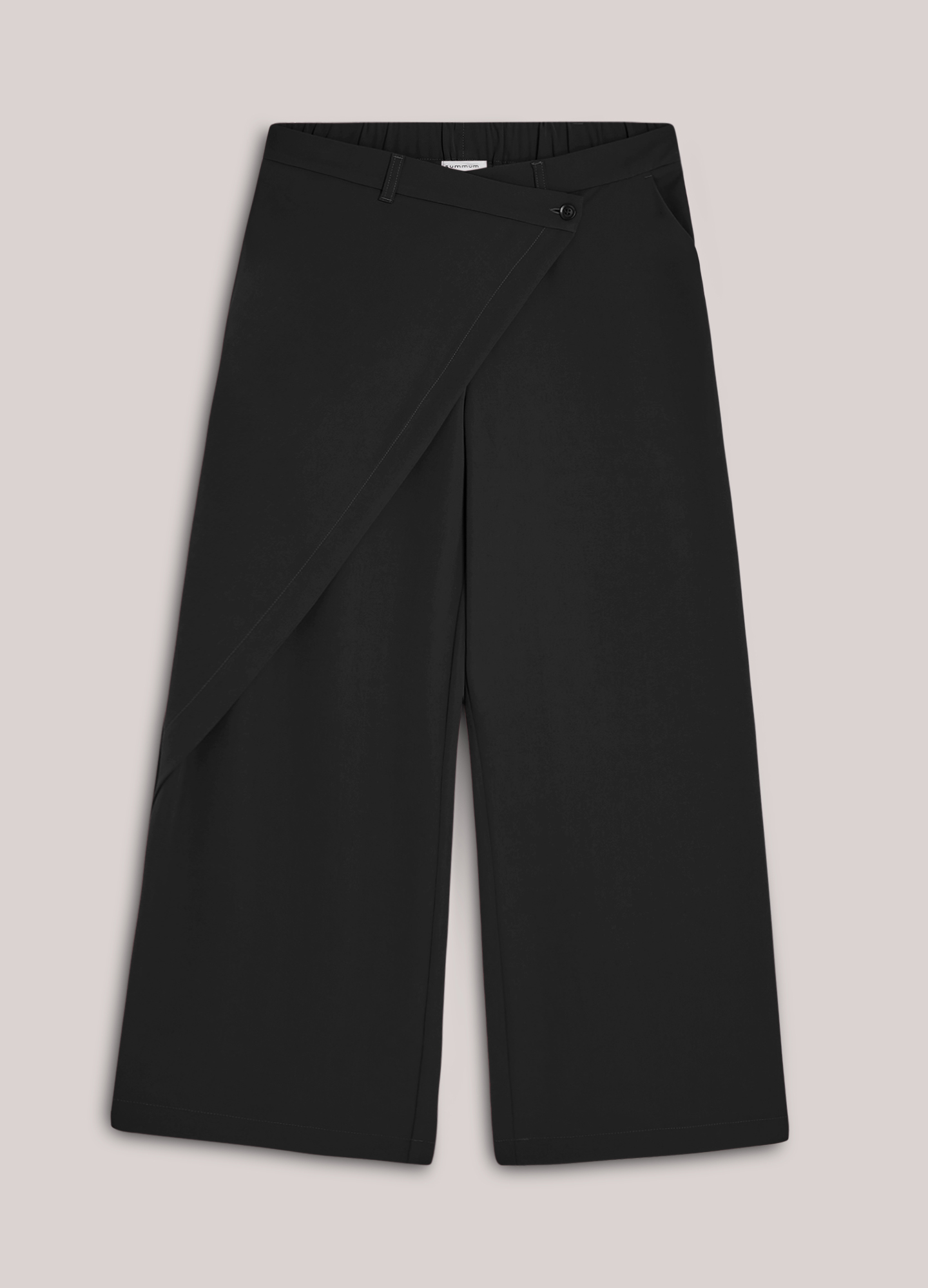 Summum Woman, zwarte pantalon met overslag aan de voorzijde. De pantalon heeft een gedeeltelijke elastische band en wijde pijp.